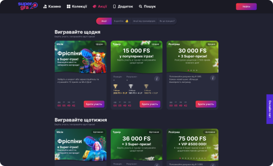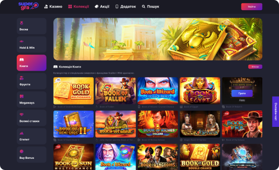 SuperGra Casino – це українське ліцензійне онлайн-казино з крутими місіями для гравців. На проєкті ви побачите низку захоплюючих турнірів, акцій, лотерей з реальними призами для гравців. SuperGra Casino гарантує своїм гравцям безпеку та надійність. На проєкті ви знайдете найкращих слот-провайдерів: 3 Oaks, Playson, Pragmatic Play, BGaming, Play'n'Go, Pushgaming, PGsoft, Endorphina, Platipus, 1spin4win, Wazdan, та багато інших всесвітньо відомих постачальників ігор. Також SuperGra Casino пропонує низку лайв-дилерів з іграми блек-джек, рулеткою, покером, баккарою та іншими. Саме тут гравці отримують незабутні враження та виграші щодня, щотижня, щомісяця!